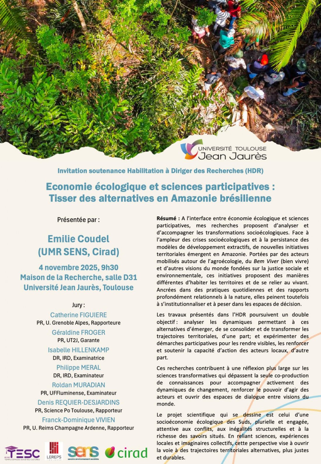 Emilie Coudel soutient son HDR (sous la garantie de Géraldine Froger) : "Economie écologique et sciences participatives" - 9h30 à l’UT2J (MdR salle D31)